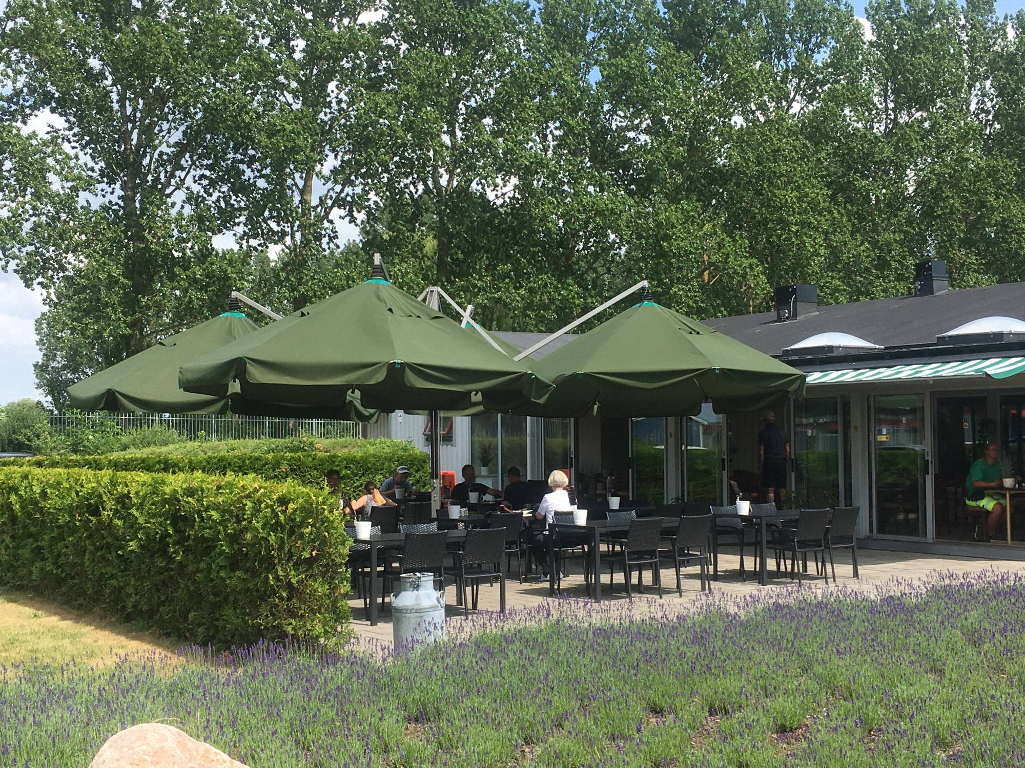 Det nya parasollet är nu på plats på uteserveringen. Nu går det bra att sitta i skydd från solen om det så önskas.